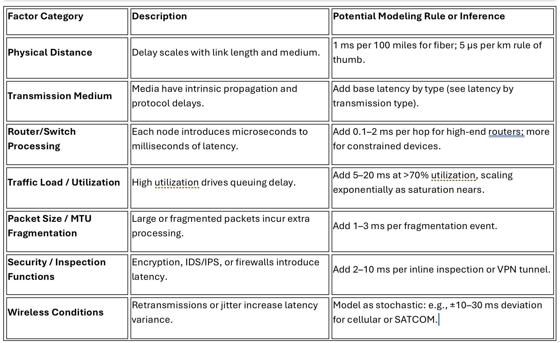 A realistic network model must combine deterministic physics with empirical or rule-based behaviors. Below are categories to model latency more accurately: